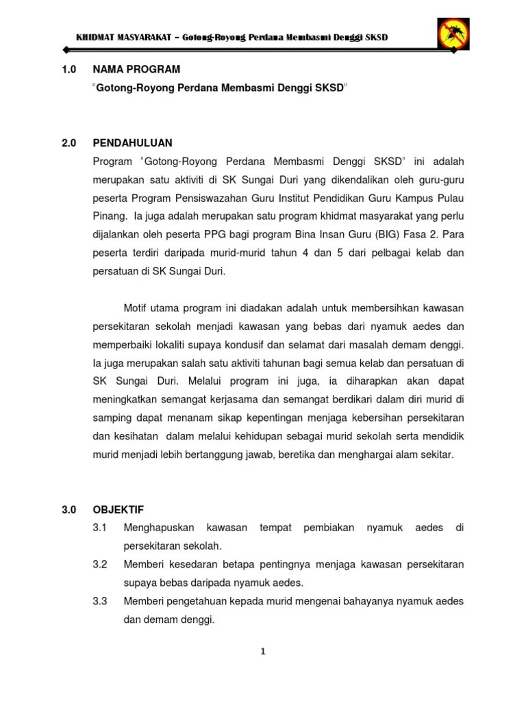 Antara aktiviti yang dirangka akan dilaksanakan meliputi aspek pembersihan kawasan longkang, kawasan pengumpulan sampah, keceriaan kawasan sekitar kampong . 2 1.0 pendahuluan sesi persekolahan bagi tahun 2018 telah bermula 2 bulan yang lalu. Kertas kerja program gotong royong perdana unit beruniform & khidmat masyarakat 2014 tarikh :